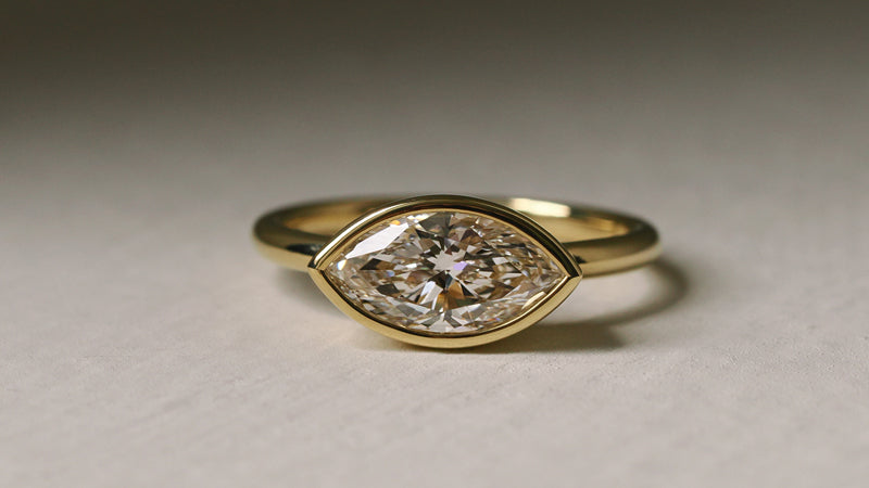 The sleek bezel setting outlines the elongated marquise diamond cut, protecting the stone while showcasing the distinctive shape. Set east west, the marquise cut appears wider, which maximizes the size.