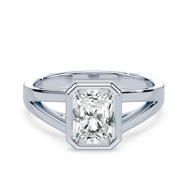 Radiant cut bezel set engagement rings