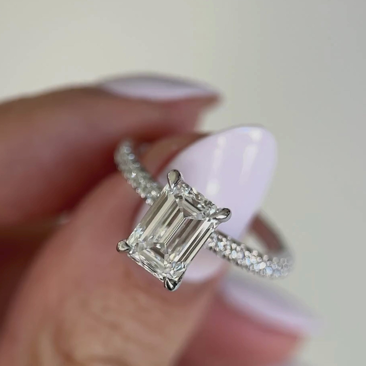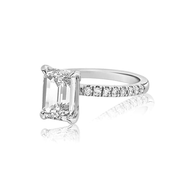 More about our Emerald Lab Grown Diamond ring with tall v setting and slim pave band: