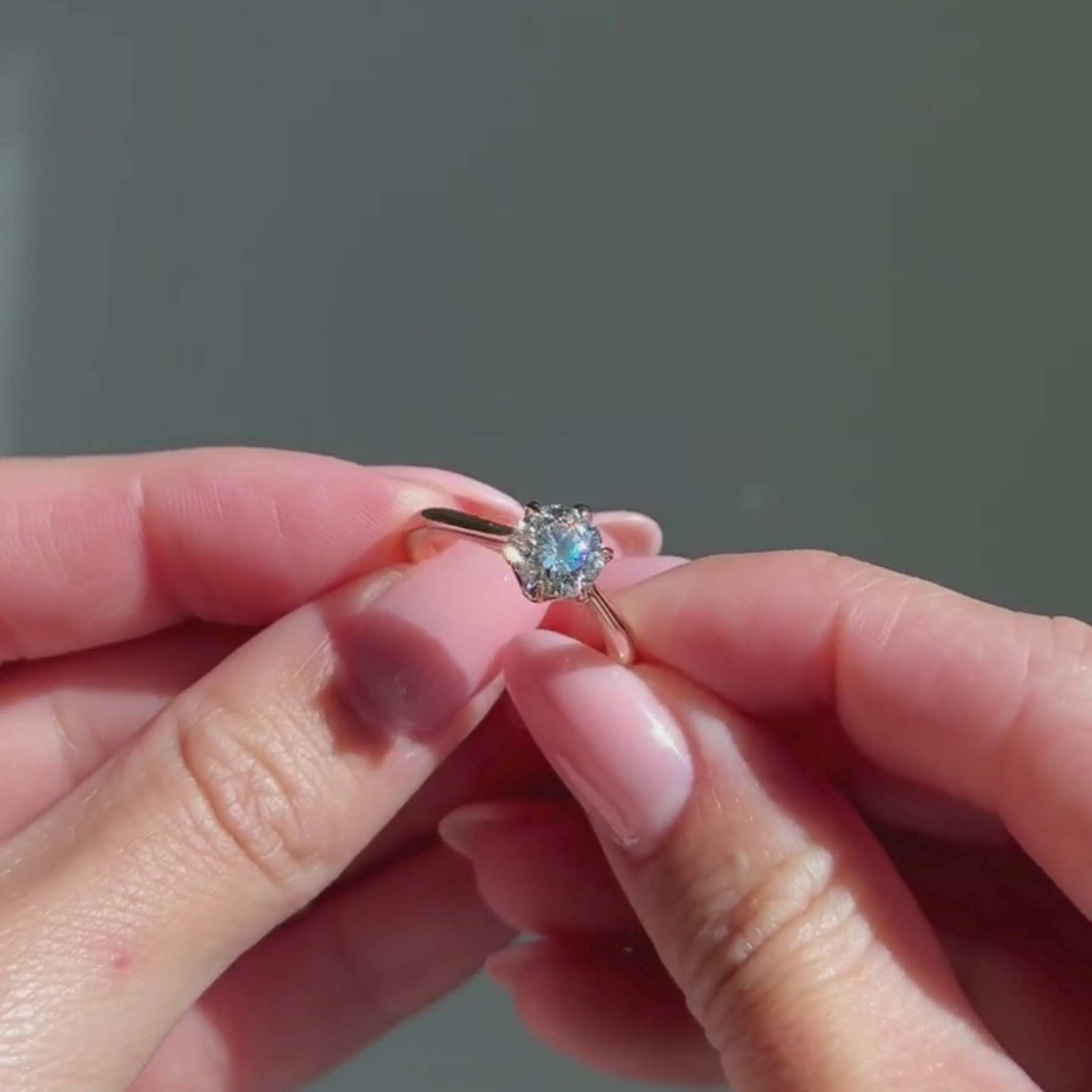 Center diamond is set in our Six Prong setting, which allows any wedding or stacking band to sit perfectly flush next to it.