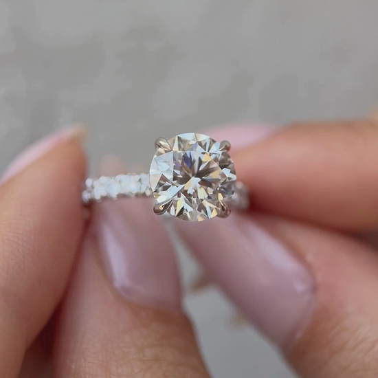 This IGI-certified, round brilliant lab grown diamond center is 3.33ct and graded F color, VVS2 clarity.